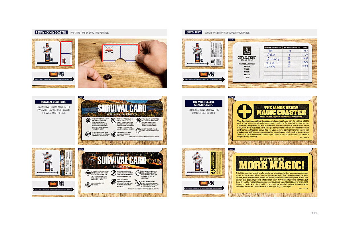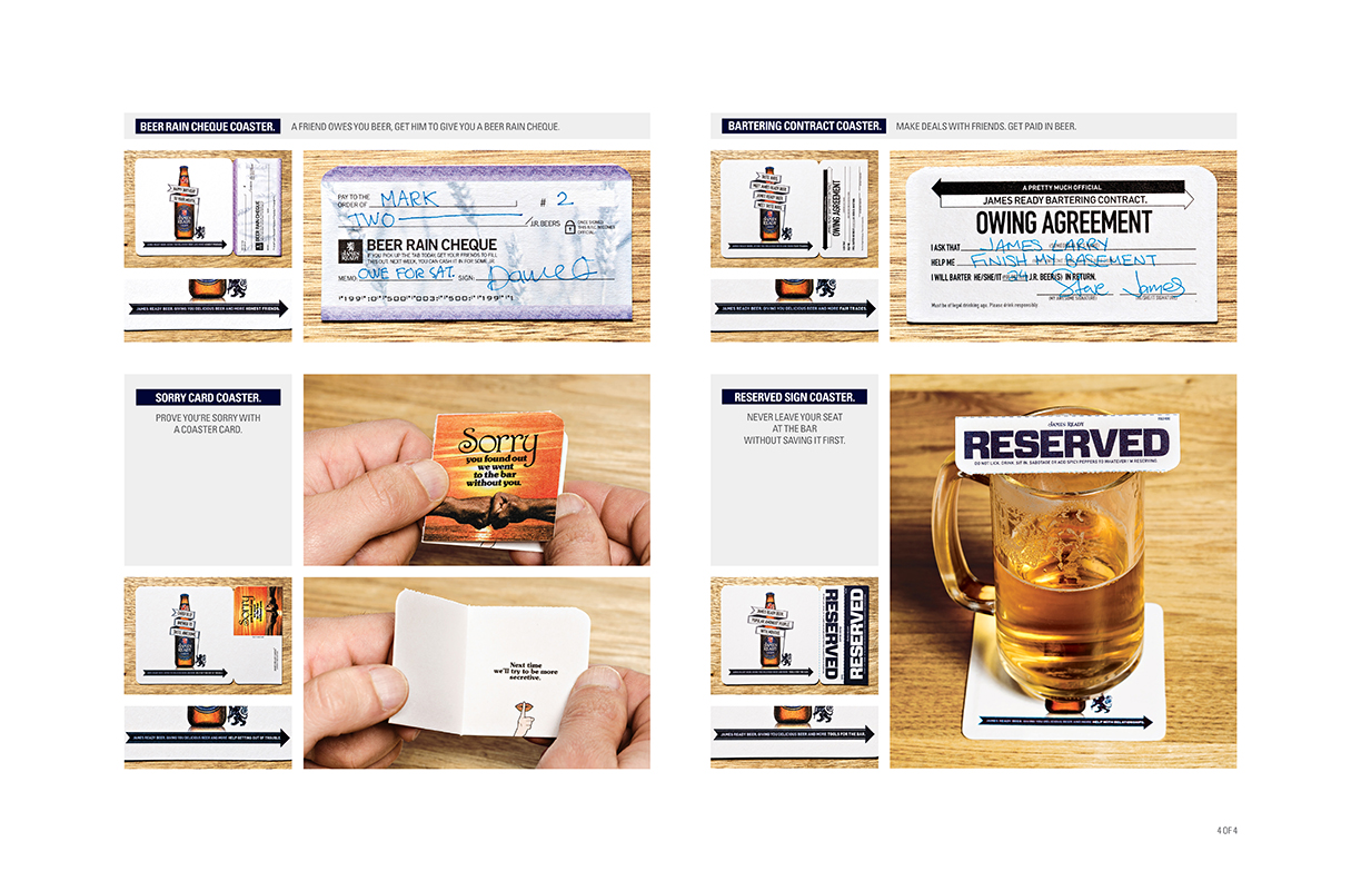 When ordering a JR, one of the 13 coasters gave drinkers more in the form of entertainment, games, information, conversation and size. Some coasters were useful by giving drinkers conversation starters and enders. There were beer rain cheques so buddies wouldn't forget to pay you back a beer. Some were playful, helping guys pass the time with bar games like penny hockey or a Guy.Q. test. Some even allowed guys to save their butts with greeting cards. Cards for their girlfriend/wife said "Where was I last night?... Your rhetorical questions are so cute." Or cards for co-workers that said "Sorry you found out we went to the bar without you… Next time we'll try to be more secretive." The cards were perforated and could be collected, saved and traded.