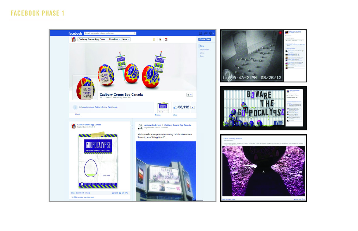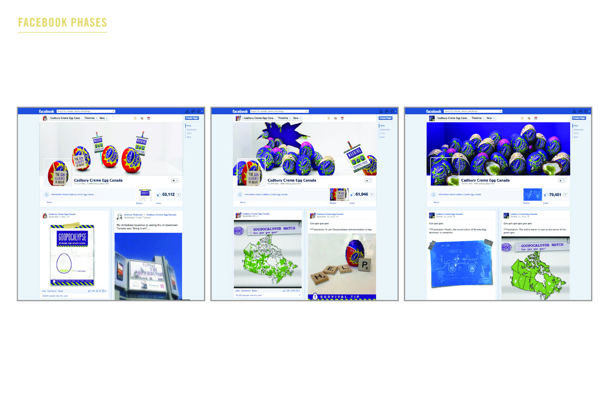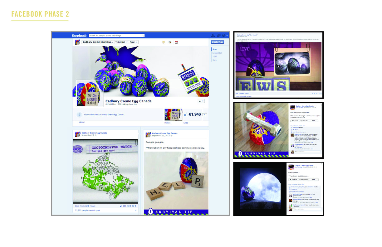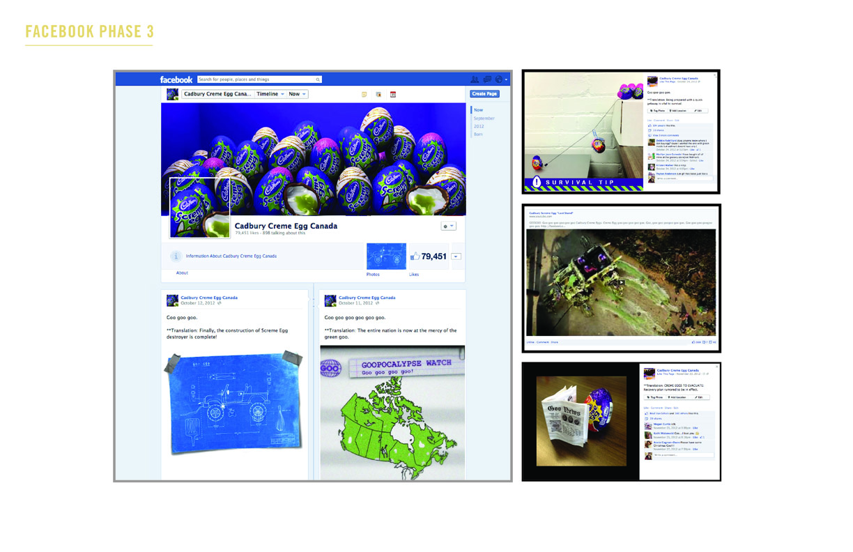 In the end, humans were encouraged to go to the Creme Egg Facebook page for ongoing Goo News reports, survival tips and sightings, all reported by the Creme Eggs themselves and written in their native tongue – Goo. Mirroring the real world infestation, this page was eventually overrun by Screme Eggs.