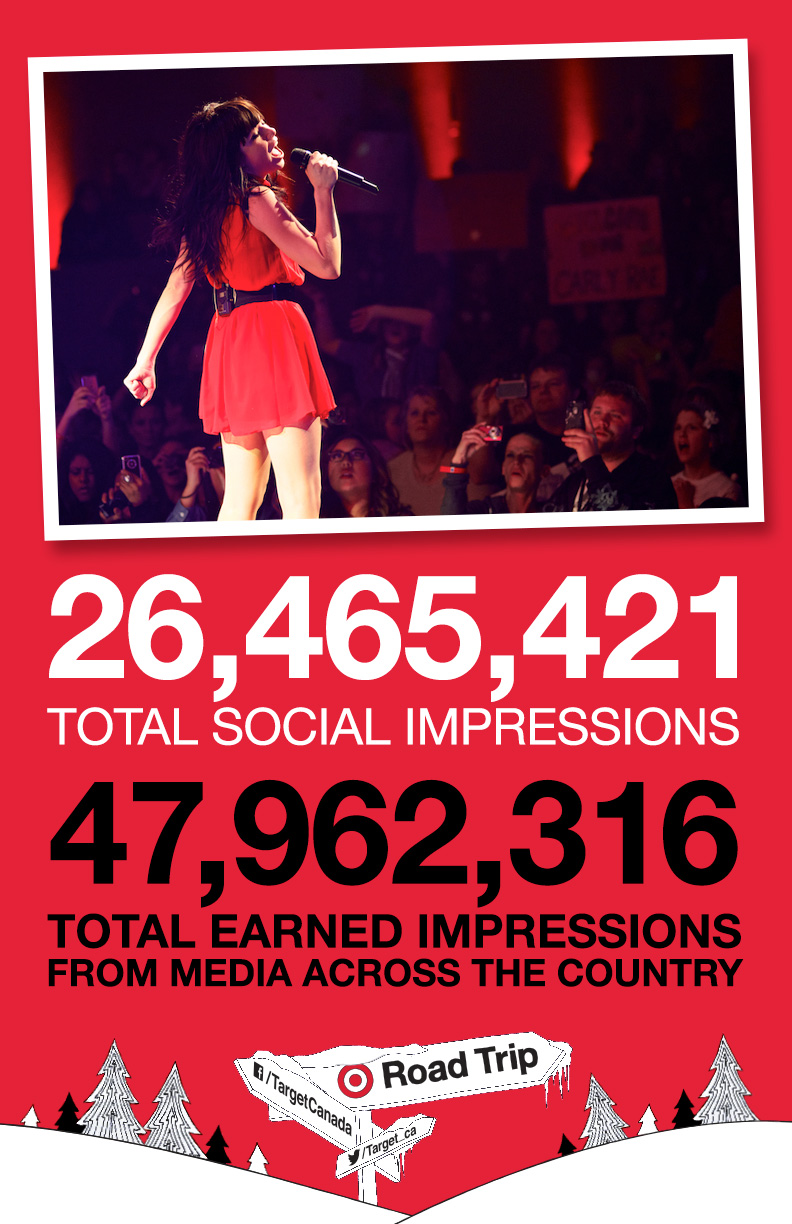 But not all consumers wanted to love Target coming to Canada. So the agency created a powerful, compelling program under the continuous story, "Target Loves Canada." Targeting all Canadians with a bull's eye on moms aged 24 to 40, this road trip travelled coast to coast and activated unique events in 24 cities in three short weeks. Events strategically catered to the different audiences in each market and included everything from an intimate holiday reading with Gordon Pinsent in Halifax, to offering Toronto commuters complimentary shuttle rides, and finally bringing Carly Rae Jepsen home for a surprise concert in Mission, B.C.