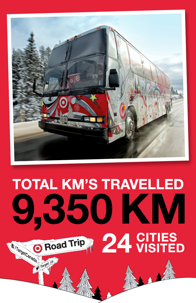 The Target Road Trip was Target Canada's first-ever, fully integrated multi-event mobile tour where Target appeared from coast-to-coast (starting in Halifax, NS, finishing in Victoria, BC) in moments and places moms and families least expected.