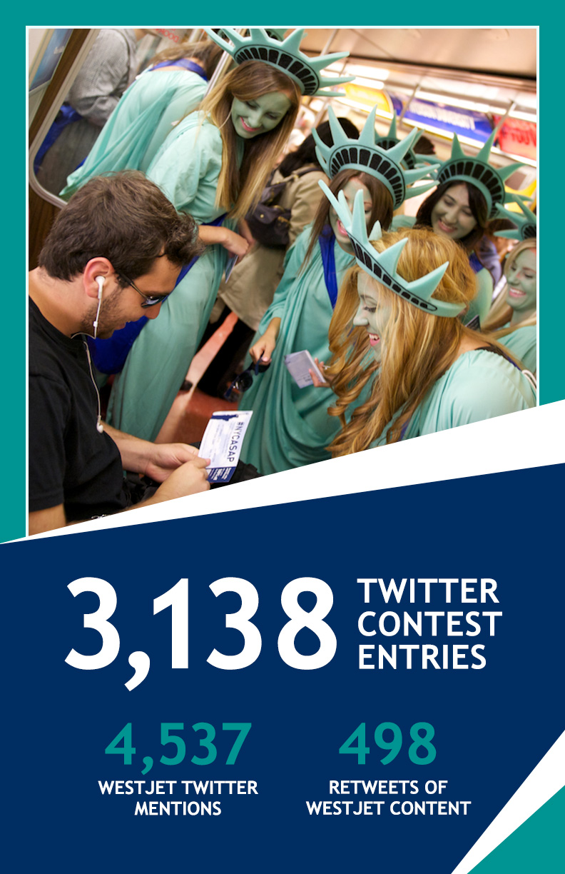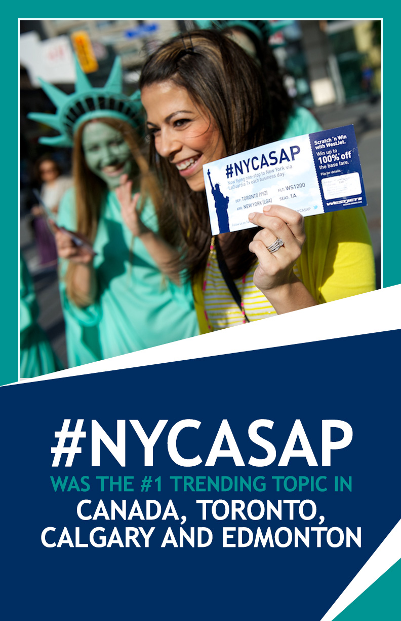 It all resulted in one of the most successful launches WestJet history. There were 4,500 @WestJet Twitter mentions online; it was the #1 trending topic in Toronto, Calgary, Edmonton, and across Canada (with program hashtag #NYCASAP); there were 3,138 Twitter contest entries to win a free flight; 15.2 million+ traditional media impressions generated and 52 news stories including prominent Toronto media such as CP24 Breakfast, Global Morning, Nationalpost.com, theglobeandmail.com, 99.9 Virgin Radio, Newstalks1010 and more.