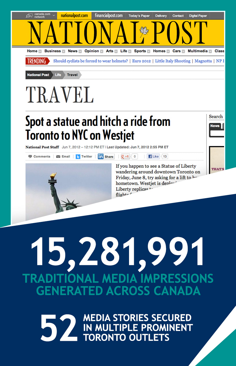 On June 8, WestJet took over the streets of Toronto by bringing New York City's most recognizable icons – the Statue of Liberty and King Kong – to life. For one day only, 100 brand ambassadors dressed as Lady Liberty invaded the streets of downtown Toronto, commuting from the edges of the Greater Toronto Area in groups moving with commuters into the city core, to spread the word about the new route. Eventually, the Statues arrived in ten different "statue spotting" locations, which had been teased out via social media earlier in the day. Those who followed the clues online and figured out where the "statue spotting" locations were, showed up to receive one of 23,000+ promotional boarding passes being distributed for a chance to win a free flight the NYC. One hundred and fifty (150) grand prizes of 100% off of a round-trip flight to New York City were won and 23,000 20% off boarding passes were distributed.